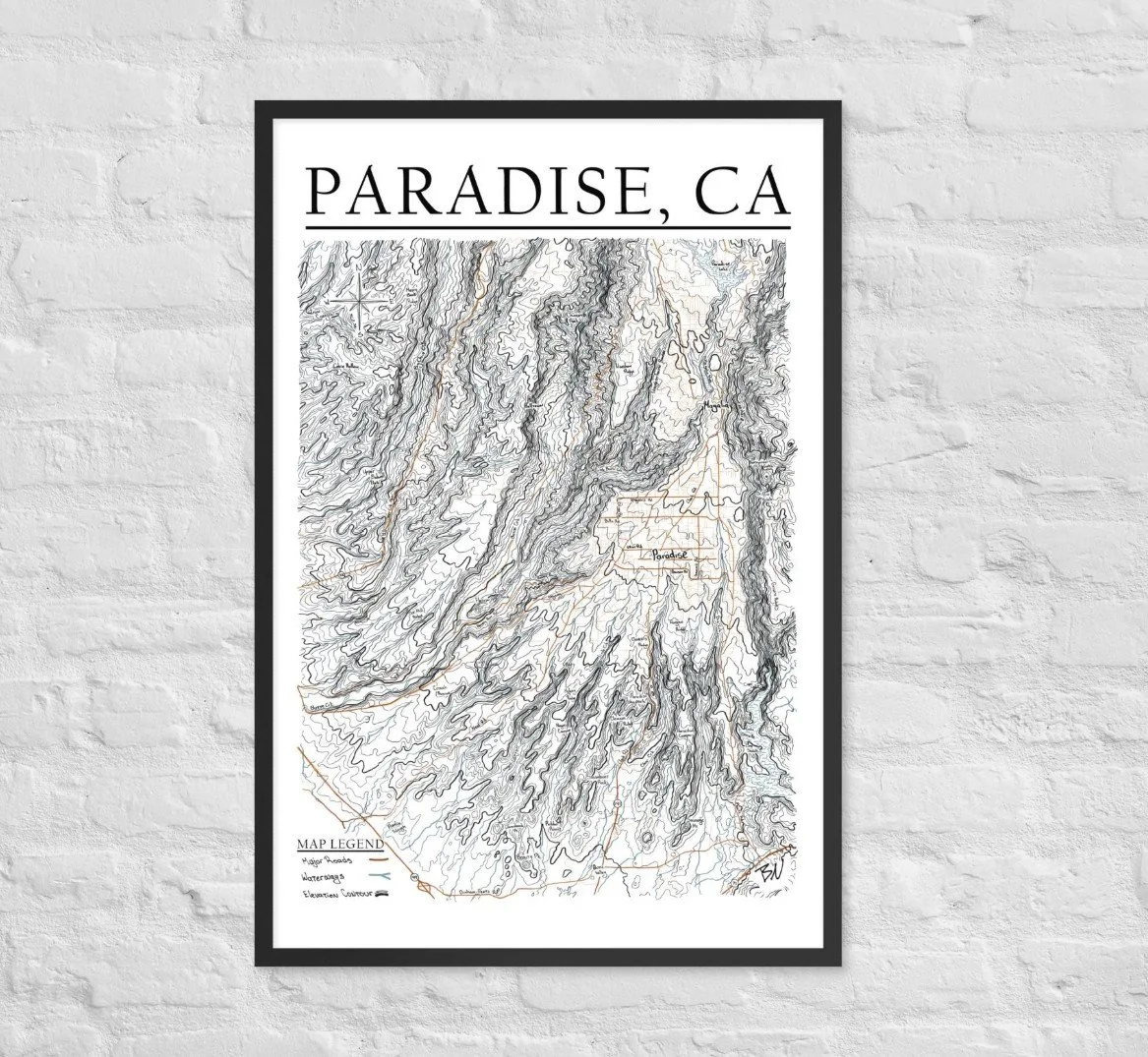 Hand Drawn Topographic Maps of Chico and Paradise, CA Paradise Poster Paradise Framed Chico and Paradise Posters Chico and Paradise Framed